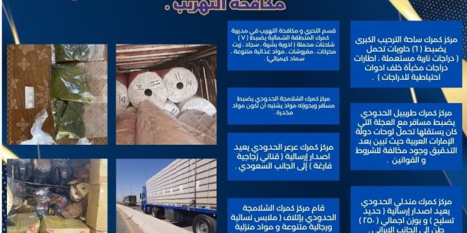 اعلنت الهيئة العامة للكمارك عن ، تواصل أقسام التحري و مكافحة التهريب والمراكز الكمركية في مختلف المنافذ الحدودية نشاطاتها الحثيثة للسيطرة على حركة البضائع والتأكد من مطابقتها للمعايير القانونية .في إطار هذه الجهود .