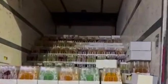 وقالت الهيئة. لقد تمكن قسم التحري ومكافحة التهريب في مديرية كمرك المنطقة الشمالية من ضبط (٥) شاحنات محمّلة بمشروبات كحولية كانت مخفية لغرض تهريبها .