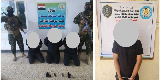 واضافت” : ان مكافحة اجرام ميسان شعبة اجرام تحركت بناءا” على توفر معلومات استدلالية حول تواجد المتهم في احدى مناطق قضاء القرنة ، ومن خلال التنسيق المشترك ومقاطعة المعلومات مع مكافحة اجرام البصرة تمت الإطاحة به .